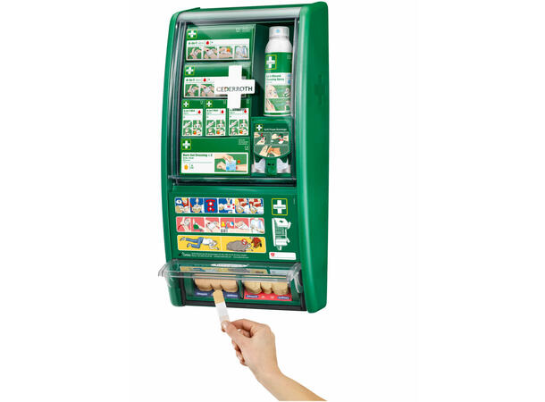 Cederroth førstehjelpsstasjon kan håndtere flere typer skader, og kan også tilpasses til forskjellige førstehjelpsbehov. Med en komplett førstehjelpsutrustning på din arbeidsplass håper vi at flere skal kunne og våge å hjelpe når en ulykke inntreffer.