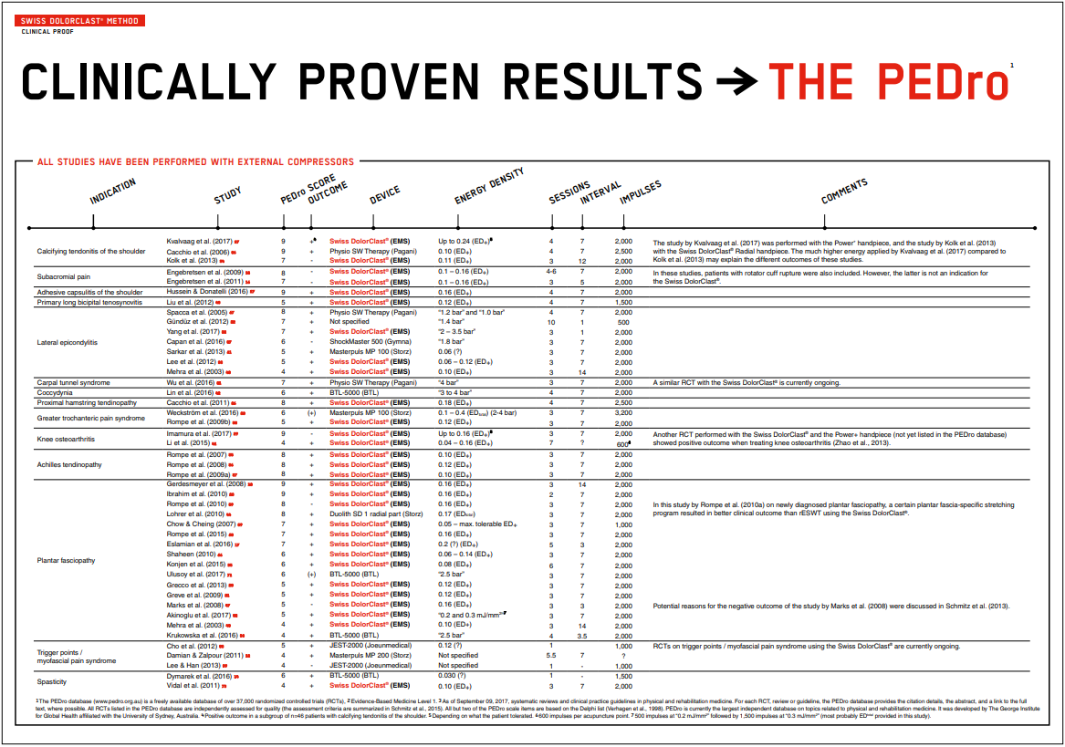 Trykkbølgebehandling har de siste årene vært et prioritert forskningsområde og resultatene er positive. Majoriteten av RCT-studiene i databasen PEDro har blitt utført med EMS DolorClast, som regnes å være gullstandarden innen trykkbølgebehandling. 80% av studiene viste at behandling med EMS DolorClast ga et bedre klinisk resultat enn kontrollgruppen.