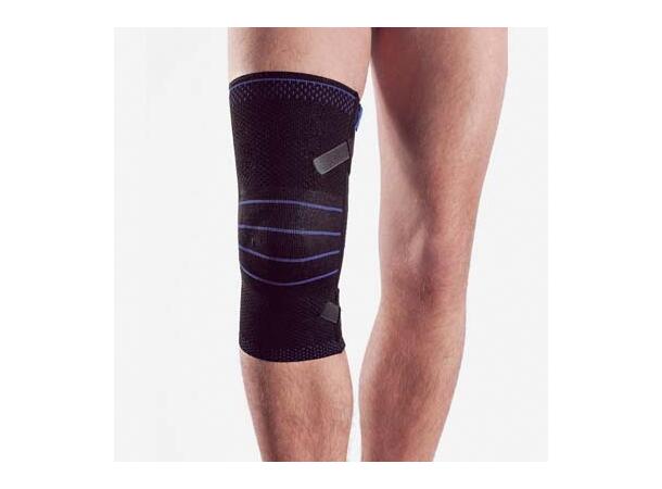 med tre komprimeringssoner for god støtte. Puten er fast plassert på lateralsiden. Hvis medial er nødvendig må man bestille for motsatt side. Puten har to semi-elastiske bånd som gir effektiv støtte. Stoffet bak kneet er vevd inn i en porøs struktur for å øke komfort. Det er spiralfjærer på begge sider av kneleddet for en enkel støtte.