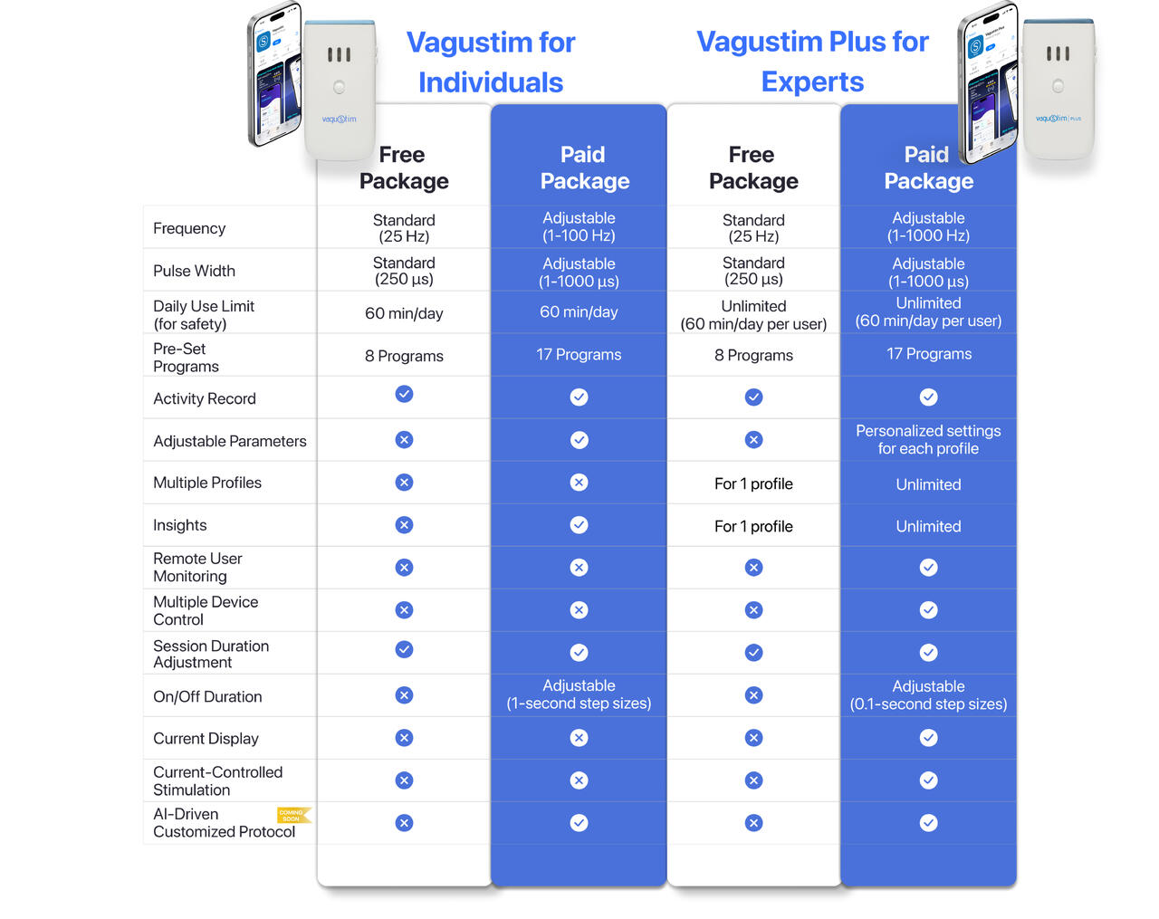 Da Vagustim v2 egner seg best for hjemmebruk basert på sine begrensninger på bla. stimuleringstid og antall brukere, er Vagustim v2 Plus designet for bruk i klinisk praksis.